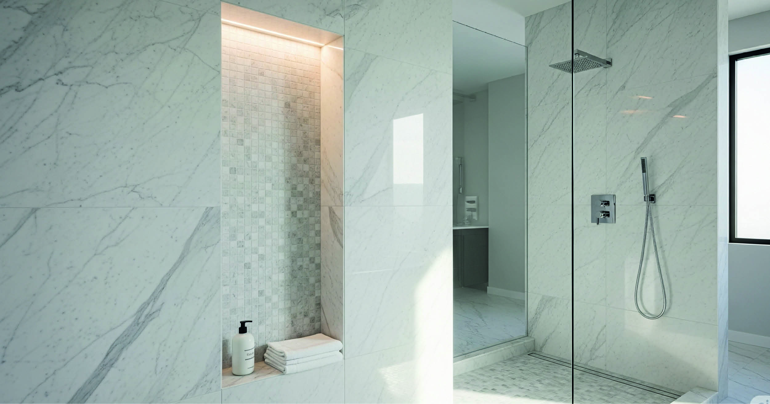 Un'altra idea, specialmente se hai una doccia grande o una nicchia lunga, è quella di includere un piccolo ripiano di marmo o un altro materiale per creare un'area di appoggio per i prodotti, separata dal resto. In questo modo, puoi tenere i tuoi prodotti preferiti a portata di mano e al riparo da schizzi e umidità.