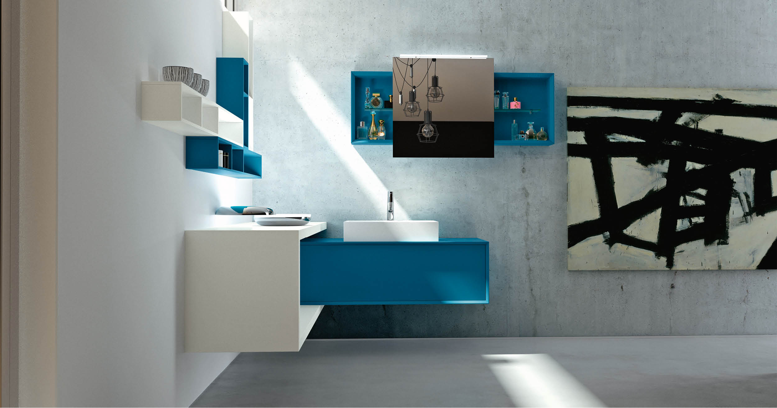 Come appena descritto, la parola d’ordine per questo mix è: colore! Blu, rosso e giallo, toni accesi e a contrasto. Piastrelle in ceramica lucida colorata con arredo dalle forme geometriche e finiture grezze.