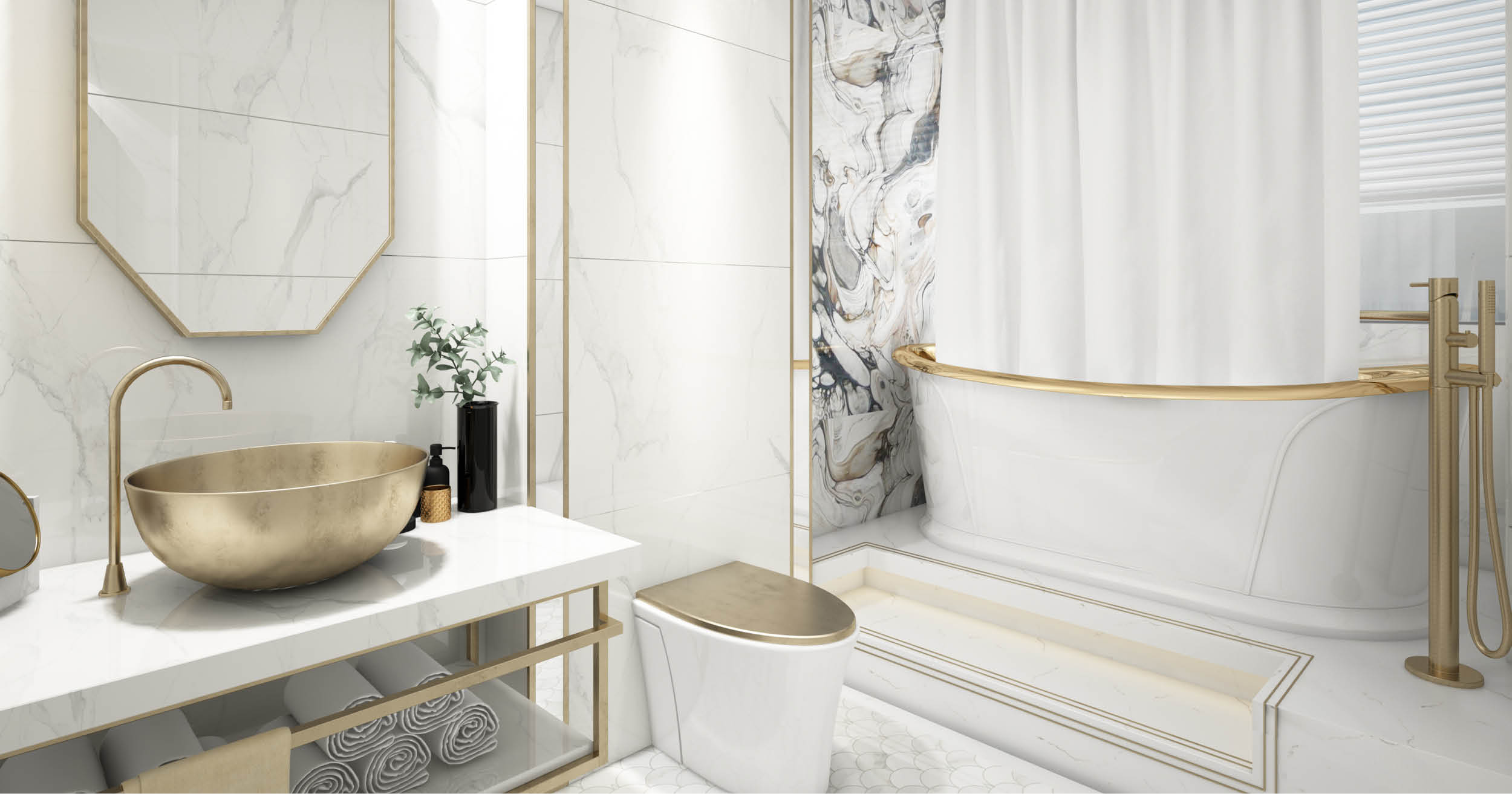 Un altro escamotage è mixare totalmente i due stili: aggiungi una cornice dorata intorno allo specchio, ma illuminalo con dei faretti moderni; opta per sanitari bianchi e sospeso e abbinali a una rubinetteria con doppia manopola; infine, spazio permettendo, inserisci una minimalista doccia walk-in insieme a una vasca da bagno vintage.